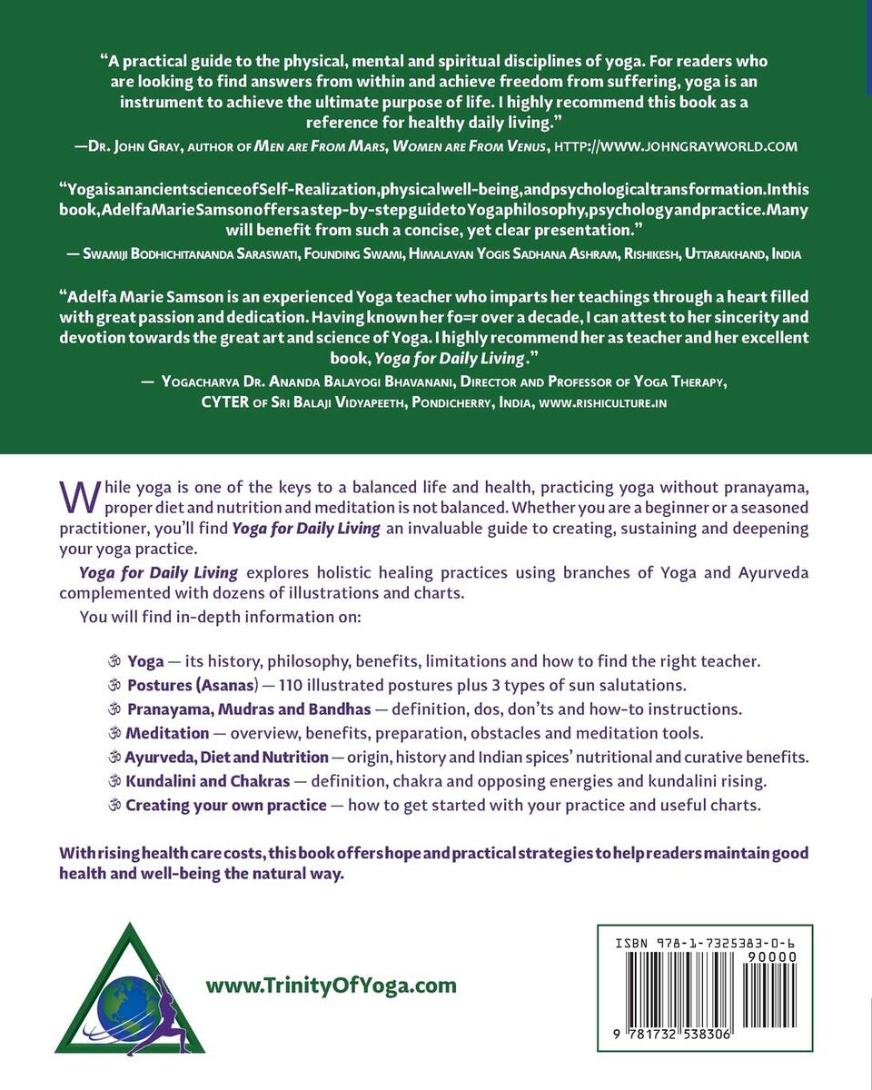 Her additional training in Reiki, Thai Yoga Massage, Shiatsu and Acupressure, Reflexology, Ayurveda and Yoga Therapy has given her in-depth knowledge of yoga and other health-related disciplines. She is currently building her online courses to offer through her website, Www.TrinityOfYoga.com. She authored Yoga for Daily Living, Balancing Body, Mind and Spirit for Health, Happiness and Peace; ISBN: 978-1-7325383-0-6 for soft cover and 978-1-7325383-1-3 for ebook. The three main BISAC codes are: HEA025000 HEALTH & FITNESS / Yoga, PHI015000 PHILOSOPHY / Mind & Body and OCC010000 BODY, MIND & SPIRIT / Mindfulness & Meditation.